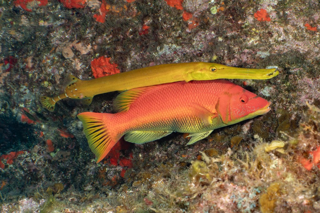 Un pejeperro (Bodianus scrofa) y pez trompeta (Aulostomus maculatus) El Hierro